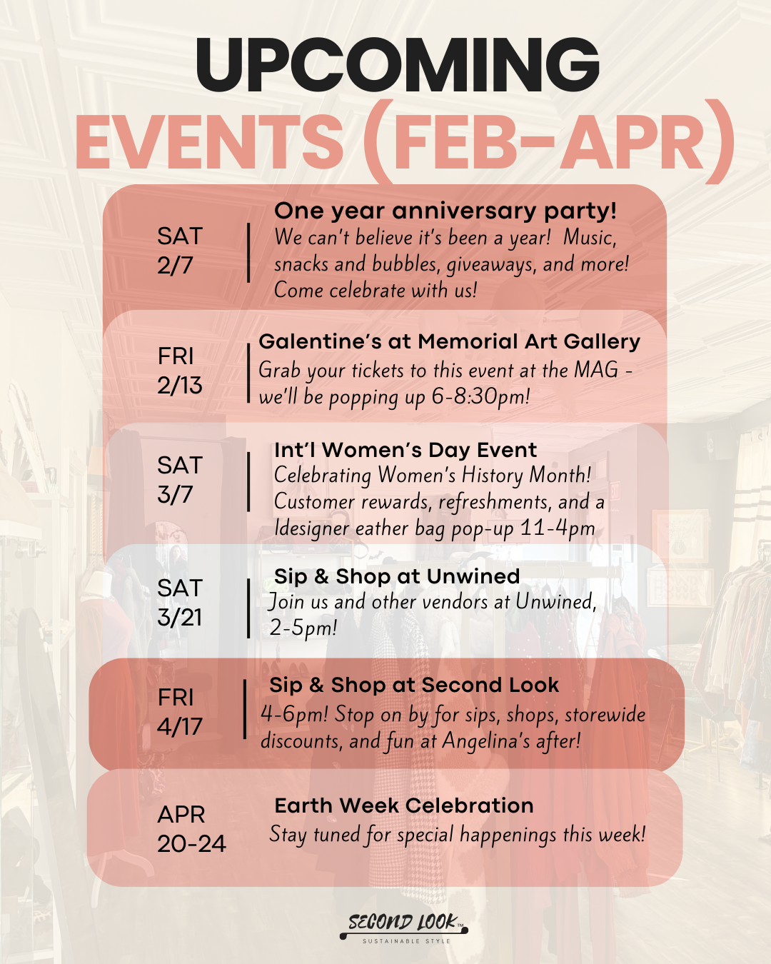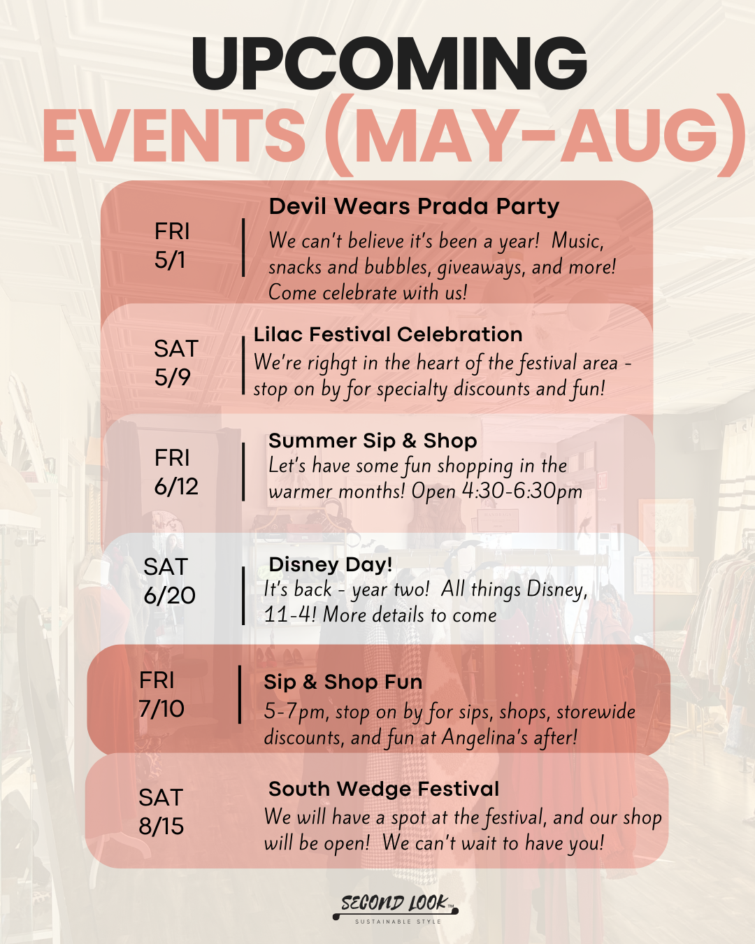 Hi there! Our consignment and secondhand boutique (which just turned one years old!) is in the South Wedge of Rochester NY. We invite you to learn more about our brand and mission, check out our event space for booking your own Sip and Shop or private event, and schedule an appointment to sell your unique treasures and give them new life.